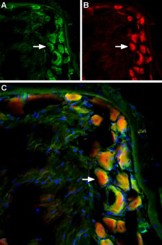 Multiplex staining of TRPV2 and mGluR5 in rat DRGImmunohistochemistry of rat dorsal root ganglion using Guinea pig Anti-TRPV2 (VRL1) (extracellular) Antibody (#ACC-039-GP) (1:60) and Anti-mGluR5 (extracellular)-ATTO Fluor-594 Antibody (#AGC-007-AR), (red), (1:60). A. TRPV2 staining (green). B. mGluR5 staining (red). C. Merge of A and B demonstrates co-localization of TRPV2 and mGluR5 in DRG cells. Nuclei are stained using DAPI as the counterstain (blue).