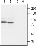 Western blot analysis of rat brain (lanes 1 and 3) and rat RBL basophilic leukemia cell lysate (lanes 2 and 4):1,2. Guinea pig Anti-TRPV2 (VRL1) (extracellular) Antibody (#ACC-039-GP), (1:2000).