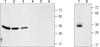 Western blot analysis of rat kidney (lanes 1 and 4), rat brain (lanes 2 and 5), mouse brain (lanes 3 and 6) membranes and human CCF-SSTGI brain astrocytoma (lanes 7 and 8) cell line lysate:1-3,7. Anti-VDAC Antibody (#AVC-001), (1:200).