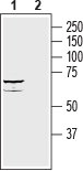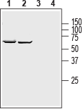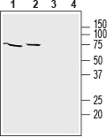 Western blot analysis of human Jurkat T-cell leukemia cell line (lanes 1 and 3) and human K562 chronic myelogenous leukemia cell line (lanes 2 and 4) lysates:1,2. Anti-ZIP8 (SLC39A8) (extracellular) Antibody (#AZT-008), (1:200).