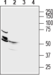 Western blot analysis of mouse kidney (lanes 1 and 3) and rat small intestine (lanes 2 and 4) lysates:1,2. Anti-ZnT2 (SLC30A2) Antibody (#AZT-012), (1:200).