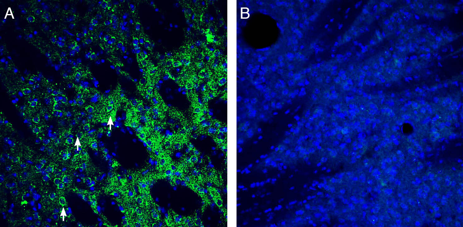Expression of ZIP14 in mouse striatum.Immunohistochemical staining of perfusion-fixed frozen mouse brain sections with Anti-ZIP14 (SLC39A14) Antibody (#AZT-024), (1:300), followed by goat anti-rabbit-AlexaFluor-488. A. ZIP14 immunoreactivity (green) appears in neuron profiles (arrows). B. Pre-incubation of the antibody with ZIP14 (SLC39A14) Blocking Peptide (BLP-ZT024), suppressed staining. Cell nuclei are stained with DAPI (blue).