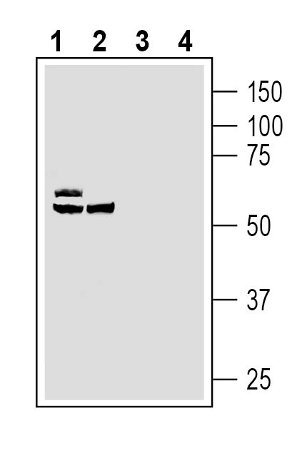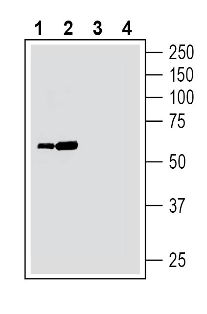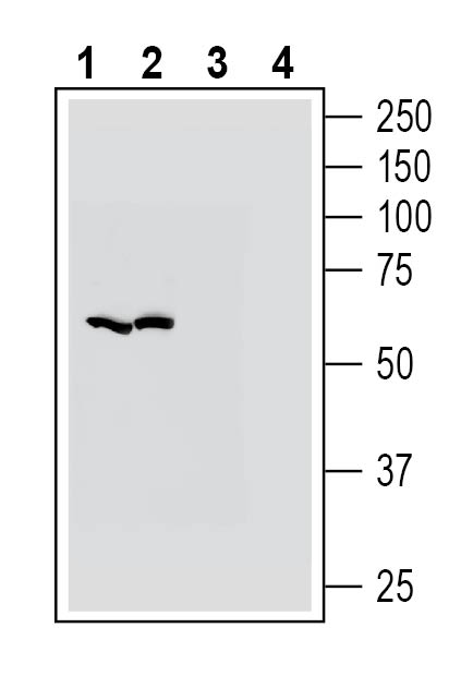 Western blot analysis of mouse brain membranes (lanes 1 and 3) and rat brain membranes (lanes 2 and 4):1-2. Anti-ZIP14 (SLC39A14) Antibody (#AZT-024), (1:200).
