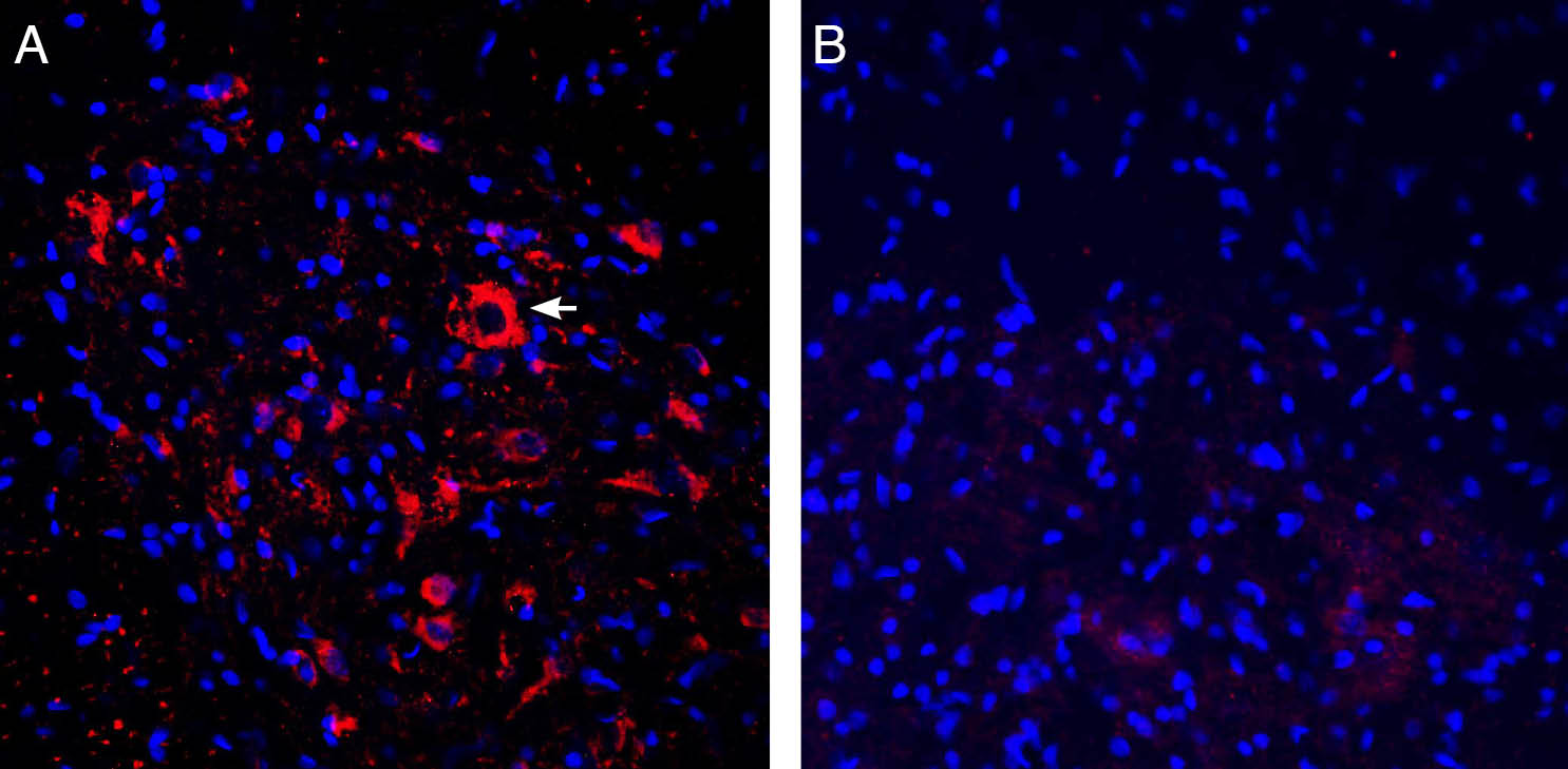 Expression of ASIC2a in rat spinal cord.Immunohistochemical staining of perfusion-fixed frozen rat spinal cord sections with Anti-ASIC2a Antibody (#ASC-012), (1:300), followed by donkey anti-rabbit-Cy3. A. ASIC2a immunoreactivity (red) appeared in neuronal soma (horizontal arrow) in the ventral horn of the spinal cord. B. Pre-incubation of the antibody with ASIC2a Blocking Peptide (BLP-SC012), suppressed staining. Cell nuclei are stained with DAPI (blue).