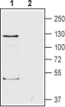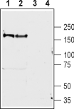 Western blot analysis of rat (lanes 1 and 3) and mouse (lanes 2 and 4) brain lysates:1,2. Anti-BAI1 (extracellular) Antibody (#ABR-021), (1:200).