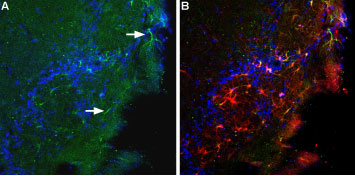 Expression of BAI1 in mouse olfactory bulbImmunohistochemical staining of mouse perfusion-fixed olfactory bulb frozen sections using Anti-BAI1 (extracellular) Antibody (#ABR-021), (1:200). A. BAI1 (green) is expressed in astrocyte-like cells (arrows). B. Double-staining of BAI1 (green) and glial fibrillary acidic protein (red) reveals expression of BAI1 in a subset of astrocytes. Nuclear staining of cells using the DNA dye DAPI (blue).