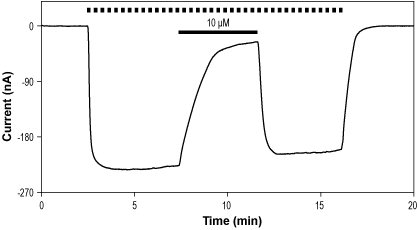 Alomone Labs (-)-Bicuculline methochloride inhibits GABA(A) receptors expressed in Xenopus oocytes.Time course of GABA(A) α1/β2 currents, activated by a continuous application (top dotted line) of 1 µM γ-Aminobutyric acid (#G-110), and reversibly inhibited by 10 µM (-)-Bicuculline methochloride (#B-137), as indicated (bar), at a holding potential of -60 mV.