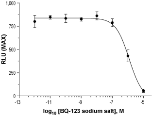 Alomone Labs BQ-123 sodium salt inhibits ET-A receptor-mediated Ca2+ mobilization in CHO cells.Dose-response curve of BQ-123 sodium salt (#B-185) inhibition of the ET-A receptor-mediated, endothelin-1-evoked Ca2+ mobilization. Cells were loaded with Calcium 6 dye, incubated with BQ-123 sodium salt, and stimulated with 15 nM endothelin-1 (EC80). Changes in intracellular Ca2+ levels were detected as changes in maximum relative fluorescence (RLU) using FLIPRTETRA™.
