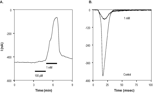 Alomone Labs Carbamazepine inhibits NaV1.2 channels currents in Xenopus oocytes.A. Time course of NaV1.2 channel reversible inhibition by 100 µM and 1 mM Carbamazepine (#C-105). Currents were elicited by a voltage step to -20 mV (100 ms) every 10 seconds from a holding potential of -100 mV. B. Example traces of current response to voltage step application before and during 1 mM Carbamazepine application.