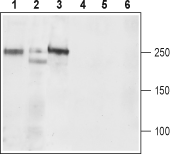 Western blot analysis of rat brain (lanes 1 and 4), mouse brain (lanes 2 and 5), and rat C6 brain Glioma (lanes 3 and 6) lysates:1-3. Anti-CaV1.3 (CACNA1D) (extracellular) Antibody (#ACC-311), (1:200).