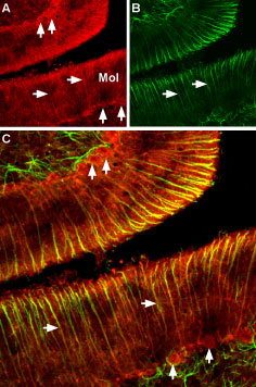 Expression of CNGA2 in rat cerebellumImmunohistochemical staining of rat cerebellum using Anti-CNGA2 Antibody (#APC-045). A. CNGA2 (red) appears in Purkinje cells (vertical arrows) and in astrocytic fibers (horizontal arrows) traversing the cerebellar molecular layer (Mol). B. Staining of astrocytes with mouse anti-glial fibrillary acidic protein (GFAP, green) demonstrates the full distribution of astrocytic fibers (horizontal arrows) in the cerebellum. C. Confocal merge of panels A and B.