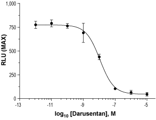 Cells were loaded with Calcium 6 dye, incubated with Darusentan, and stimulated with 15 nM Endothelin-1 (EC80). Changes in intracellular Ca2+ levels were detected as changes in maximum relative fluorescence (RLU) using FLIPRTETRA™.