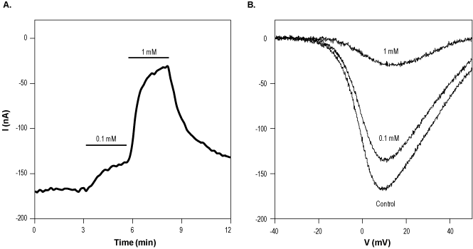 A. Time course of CaV1.2/α2-δ1/β1 (L-type) current inhibition by 100 µM and 1 mM Diltiazem hydrochloride (#D-135). Currents were elicited by application of voltage ramp from a holding potential of -80 mV to 0 mV (100 msec). B. Superimposed example traces of current responses before and during perfusion of 100 µM and 1 mM Diltiazem hydrochloride as indicated.