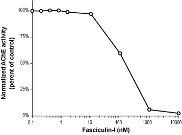 Alomone Labs Fasciculin-I potently inhibits Acetylcholinesterase (AChE) activity.AChE activity was determined colorimetrically using Ellman's reagent, as production of thiocholine from acetylthiocholine. Absorbance was measured at 405 nm after a 30 min incubation. Normalized activity of 400 mU/ml human AChE, as per cent of control, was plotted against increasing concentrations of Fasciculin-I (#F-650), showing concentration-dependent inhibition with pIC50 ≈ 6.7.