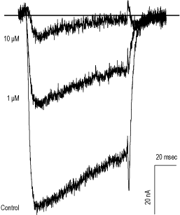 Superimposed current traces of L-type channels (CaV1.2+α2δ1+β1a), before and during applications of 1 and 10 μM Felodipine (#F-105) as indicated on the left. Holding potential was -100 mV and currents were elicited every 10 seconds by 100 ms steps to +10 mV.