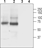 Western blot analysis of rat (lanes 1 and 3) and mouse (lanes 2 and 4) brain lysate:1,2. Anti-GABA Transporter 3 (GAT-3) Antibody (#AGT-003), (1:500).
