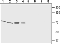 Western blot analysis of rat brain membrane (lanes 1 and 5), mouse brain lysate (lanes 2 and 6), human SHSY-5Y neuroblastoma cells lysate (lanes 3 and 7) and human U87 MG glioblastoma cells lysate (lanes 4 and 8):1-4. Anti-GABA(A) ε Receptor (GABRE) (extracellular) Antibody (#AGA-015), (1:400).