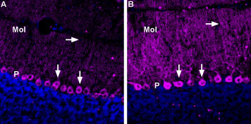 Expression of GABA(A) ε receptor in rat and mouse cerebellaImmunohistochemical staining of mouse and rat cerebellum using Anti-GABA(A) ε Receptor (GABRE) (extracellular) Antibody (#AGA-015). In both mouse (A) and rat (B) cerebellum GABA(A) ε receptor staining (purple) appears in the Purkinje cell body (P and vertical arrows) and in their dendritic tree (horizontal arrow) extending into the molecular layer (MOL). Nucler staining using DAPI as the counterstaining (blue).