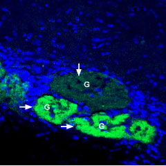Expression of Glucose Transporter 4 in rat olfactory bulbImmunohistochemical staining of immersion-fixed, free floating rat brain frozen sections using Anti-GLUT4 Antibody (#AGT-024), (1:400), followed by goat-anti-rabbit-AlexaFluor-488. GLUT4 staining (green) appears in some glomeruli (“G” and horizontal arrows), but not in others (vertical arrow). Cell nuclei are stained with DAPI (blue).