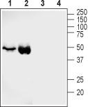 Western blot analysis of rat (lanes 1 and 3) and mouse (lanes 2 and 4) heart membranes:1,2. Anti-GLUT4 Antibody (#AGT-024), (1:400).