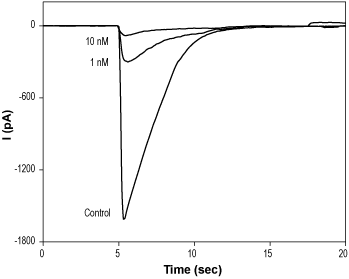 Alomone Labs Granisetron Hydrochloride blocks 5-HT3A receptors expressed in HEK 293T cells.Currents were elicited by 10 µM 5-HT, delivered every 3 minutes. Antagonist Granisetron hydrochloride (#G-105) was applied 30 seconds before stimulation at 1 and 10 nM, as indicated and inhibited the 5-HT induced current in a dose-dependent and reversible manner.