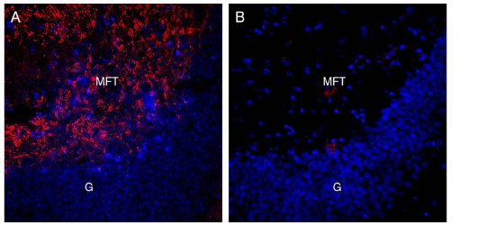 Expression of Alpha-Synuclein in rat hippocampus.Expression of Alpha-Synuclein in rat hippocampus. Immunohistochemical staining of perfusion-fixed frozen rat brain sections with Guinea Pig Anti-Alpha-Synuclein Antibody (#APZ-035-GP), (1:300), followed by goat anti-guinea pig-AlexaFluor-594. A. Alpha-Synuclein immunoreactivity (red) appears in the mossy fiber terminal region (MFT). B. Pre-incubation of the antibody with Alpha-Synuclein Blocking Peptide (BLP-PZ035), suppressed staining. Cell nuclei are stained with DAPI (blue). G = granule layer.