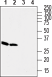 Western blot analysis of rat (lanes 1 and 3) and mouse (lanes 2 and 4) brain lysates:1,2. Guinea pig Anti-Stargazin Antibody (#ACC-012-GP), (1:500).