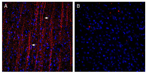 Expression of P2Y12 in rat parietal cortex.Immunohistochemical staining of perfusion-fixed frozen rat brain sections with Guinea pig Anti-P2Y12 Receptor (extracellular) Antibody (#APR-020-GP), (1:300), followed by goat anti-guinea pig-AlexaFluor-594. A. P2Y12 immunoreactivity (red) appears in axonal processes (arrows). B. Pre-incubation of the antibody with P2Y12 Receptor (extracellular) Blocking Peptide (BLP-PR020), suppressed staining. Cell nuclei are stained with DAPI (blue).