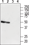 Western blot analysis of rat brain lysate (lanes 1 and 3) and mouse brain lysate (lanes 2 and 4):1,2. Guinea pig Anti-P2Y12 Receptor (extracellular) Antibody (#APR-020-GP), (1:400).