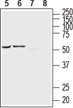 Western blot analysis of rat basophilic leukemia (RBL) cell line lysate (lanes 5 and 7) and human brain glioblastoma (U-87 MG) cell line lysate (lanes 6 and 8):5,6. Guinea pig Anti-P2Y12 Receptor (extracellular) Antibody (#APR-020-GP), (1:400).