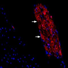 Expression of Periaxin in rat spinal dorsal root entry zoneImmunohistochemical staining of rat spinal dorsal root entry zone frozen sections using Guinea pig Anti-Periaxin Antibody (#ANR-091-GP). Periaxin immunoreactivity (red) appears in the dorsal nerve root (arrows). Nuclei are stained using DAPI as the counterstain (blue).