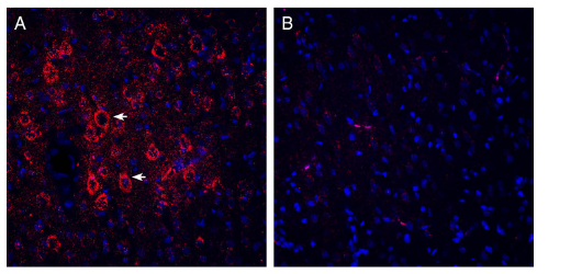 Expression of VGLUT2 in rat parietal cortex.Immunohistochemical staining of perfusion-fixed frozen rat brain sections with Guinea Pig Anti-VGLUT2 Antibody (#AGC-036-GP), (1:200), followed by goat anti-Guinea Pig-AlexaFluor-594. A. VGLUT2 immunoreactivity (red) appears in pyramidal neuronal profiles (horizontal arrows). B. Pre-incubation of the antibody with VGLUT2 Blocking Peptide (BLP-GC036), suppressed staining. Cell nuclei are stained with DAPI (blue).