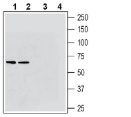 Western blot analysis of rat brain membranes (lanes 1 and 3) and mouse brain membranes (lanes 2 and 4):1-2. Guinea Pig Anti-VGLUT2 Antibody (#AGC-036-GP), (1:200).