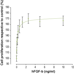 Alomone Labs Recombinant human FGF-b protein promotes the proliferation of 3T3-L1 cells.Cells were cultured with 10% bovine serum for 24 h then the serum was reduced to 0.5% and the cells were stimulated with increasing concentrations of Recombinant human FGF-b protein (#F-170). The cell proliferation was measured 2 days post stimulation using the XTT method.