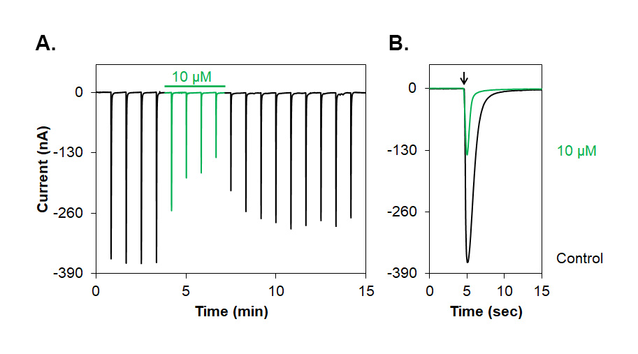 Alomone Labs IEM-1921 inhibits NMDA (NR1+NR2A) receptors expressed in Xenopus oocytes.A. Representative time course of NR1/NR2A currents, elicited by transient stimulations with 20 µM glutamate + 20 µM glycine every 50 sec, while membrane potential was held at -60 mV, and significantly inhibited by 10 μM IEM-1921 (#I-180).