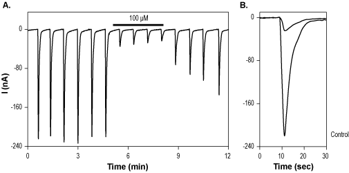 Alomone Labs Ifenprodil (+)-tartrate salt (hemitartrate salt) inhibits NMDA (NR1+NR2A) channels expressed in Xenopus oocytes.A. Time course of NMDA currents elicited with 100 µM glutamate and 100 µM Glycine, every 50s, while membrane potential was held at -80 mV. 100 µM Ifenprodil (+)-tartrate salt (hemitartrate salt) (#I-105), applied for 3 min, as indicated, reversibly inhibited current amplitude. B. superimposed current traces taken from the experiment described in A.