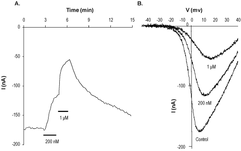 A. Time course of L-type channel (CaV1.2+α2δ1+β1a) activity before and during applications of 200 nM and 1 μM Isradipine (#I-100) (indicated by bars) and upon wash. Holding potential was -80 mV and currents were elicited every 10 seconds by 100 ms ramp to +40 mV. B. Superimposed example current traces (plotted against the corresponding ramp voltage) before and during application of 200 nM and 1 μM Isradipine as indicated (taken from the experiment described in A).