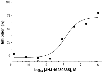 Cells were loaded with a calcium-sensitive dye, incubated with a range of JNJ 16259685 concentrations, and stimulated with 5 µM L-Glutamate (EC80). Changes in intracellular Ca2+ following stimulation were detected as changes in maximum relative fluorescence (RLU) using FLIPRTETRA™.