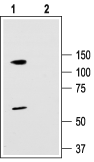 Western blotting of rat brain membranes:1. Anti-KCNC3 (KV3.3) Antibody (#APC-102), (1:200).