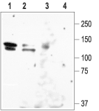 Western blot analysis of rat brain lysate (lanes 1 and 3) and HEK-KCNH1 (lanes 2 and 4):1,2. Anti-KCNH1 (EAG-1) Antibody (#APC-104), (1:200).