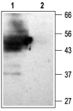 Western blot analysis of rat kidney membranes:1. Anti-KCNJ15 (Kir4.2) Antibody (#APC-058), (1:200).