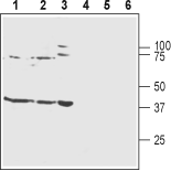 Western blot analysis of rat brain membranes (lanes 1 and 4), mouse brain membranes (lanes 2 and 5) and human SH-SY5Y neuroblastoma cell lysates (lanes 3 and 6):1-3. Guinea pig Anti-Kir4.1 (KCNJ10) Antibody (#APC-035-GP), (1:800).