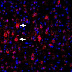 Expression of KV1.4 in rat parietal cortexImmunohistochemical staining of perfusion-fixed frozen rat brain sections using Anti-KV1.4 (extracellular) Antibody (#APC-167), (1:400), followed by donkey-anti-rabbit-biotin and streptavidin-Cy3. KV1.4 staining (red) appears in several neuronal-outlined cells (arrows). Nuclei were stained with DAPI (blue).