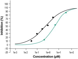 Alomone Labs L-AP4 inhibits specific binding of L-Glutamic acid to rat brain glutamate receptors.Percent inhibition of specific binding of 3.75 nM [3H]-L-Glutamic acid to membranes from whole rat brain (except cerebellum) was plotted against concentrations of L-AP4 (#L-150), (green circles) and of L-Glutamic acid (assay standard, black squares) and used to calculate IC50 and Ki values for L-AP4 (IC50 ≈ 4.49 µM, and Ki ≈ 4.43 µM).