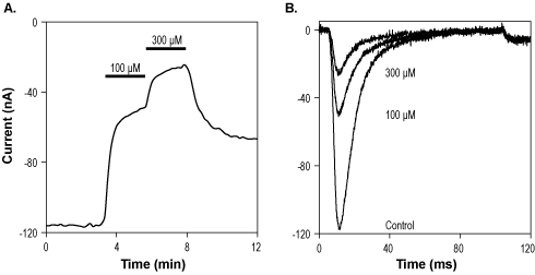 Alomone Labs Lamotrigineblocks NaV1.2 channels expressed in Xenopus oocytes.A. Time course of NaV1.2 current amplitude and inhibition by 100 and 300 µM Lamotrigine (#L-205). Currents were elicited by application of a 100 ms voltage step to 0 mV (H.P= -50 mV, to induce inactivation), every 10 seconds. B. Superimposed example traces of current responses before and during perfusion of 100 and 300 µM Lamotrigine, as indicated.