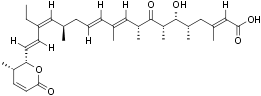 The target molecule of Leptomycin B has been shown by genetic and biochemical analyses to be CRM1, a highly conserved protein in eukaryotes. CRM1 was shown to be a member of the importin beta family and a receptor for the nuclear export signal (NES) of proteins in both yeast and mammalian cells. Leptomycin B binds directly to CRM1, which results in the dissociation of the NES from the nuclear export machinery containing CRM1 and leads to the nuclear accumulation of many proteins in both yeast and mammalian cells.5-7