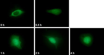 Alomone Labs Leptomycin B induces nuclear accumulation of NF-κB in HEK-293 cells.Cells were transiently transfected with green fluorescent protein (GFP) fused to NF-AB (NF-κB-GFP). After 3 days, the transfected cells were treated with 40 nM Leptomycin B (#L-500) and incubated for different times. The images represent the distribution of NF-κB-GFP in the cytosol which becomes nuclear upon Leptomycin B treatment.
