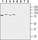 Western blot analysis of rat brain membrane (lanes 1 and 5), mouse brain membrane (lanes 2 and 6), human acute lymphoblastic leukemia (MOLT-4) (lanes 3 and 7) and human colorectal adenocarcinoma (HT-29) cell lysates:1-4. Anti-LETM1 Antibody (#ANT-183), (1:1500).
