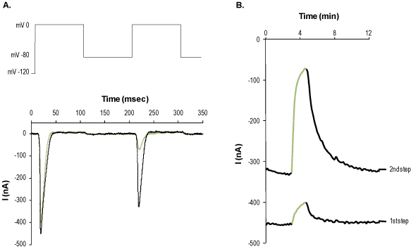 Alomone Labs Lidocaine inhibits NaV1.2 channels expressed in Xenopus oocytes.A. Currents were elicited by a double test pulse protocol applied every 10 sec, which is schematically described on the top panel. For the first pulse the holding potential was -120 mV while the second pulse was preceded by 100 ms at -80 mV. On the bottom; superimposed example current responses to the voltage stimulation, before (black) and during application of 0.5 mM Lidocaine (#L-105), (green). B. Time course of NaV1.2 current amplitude changes as a result of Lidocaine application, for each of the two test pulses (demonstrating the dependency of the inhibition on the voltage driven conformation of the channel).