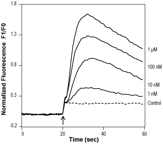 Alomone Labs MMK1 evokes a concentration-dependent rise in intracellular Ca2+ in non-differentiated HL-60 cells.Non-differentiated HL-60 cells were loaded with Fluo-3 AM. Changes in intracellular Ca2+ were detected via changes in Fluo-3 emission following agonist application. Application of MMK1 evoked a concentration-dependent rise in intracellular Ca2+. Normalized fluorescence before and after application (arrow) of control and of 1 nM, 10 nM ,100 nM and 1 µM MMK1 (as indicated).